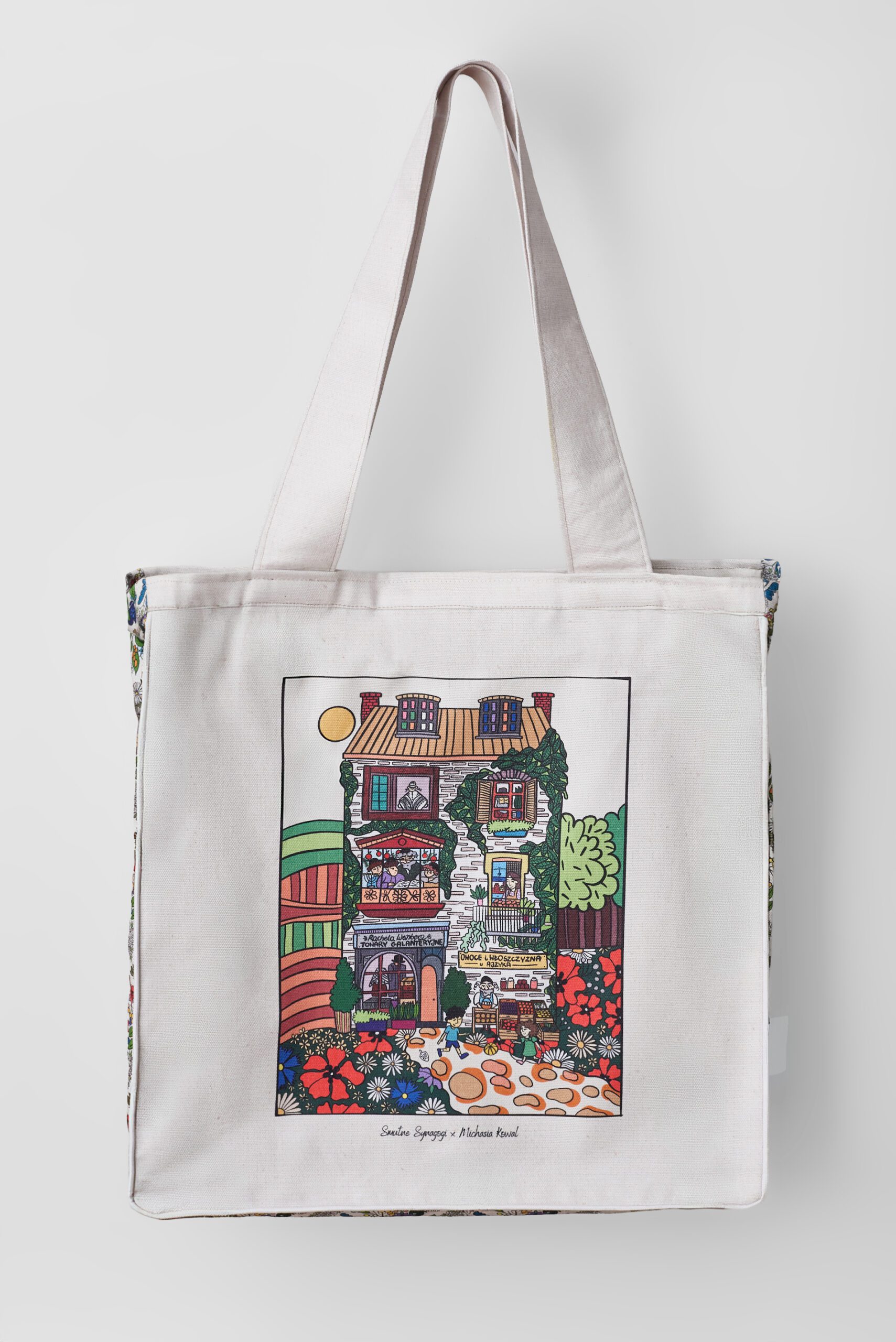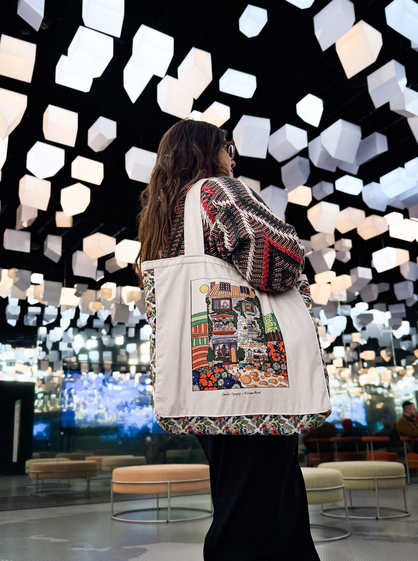 Ilustracja na torbie została stworzona przez polską artystkę Michalinę Kowal i przedstawia baśniowy sztetl — żydowskie miasteczko pełne codziennych historii, światła i drobnych rytuałów.