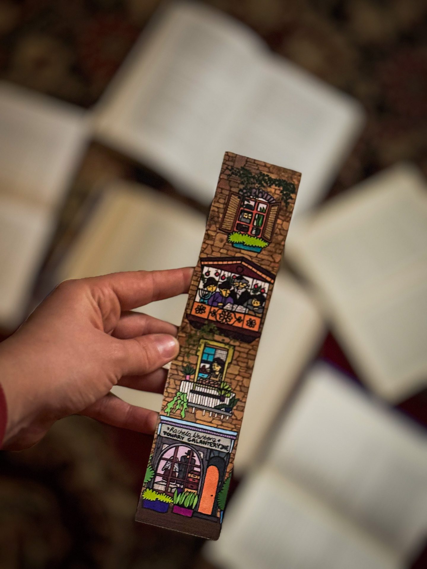 Zakładka inspirowana projektem „W oknach sztetla” to drobny, piękny przedmiot, który przenosi do świata miasteczek, w których przez stulecia żyła żydowska społeczność. Radosny wzór przedstawia okna – te realne i te symboliczne – przez które spoglądamy na codzienność dawnych sztetli: świat pełen gwaru, koloru, zapachów i małych historii.